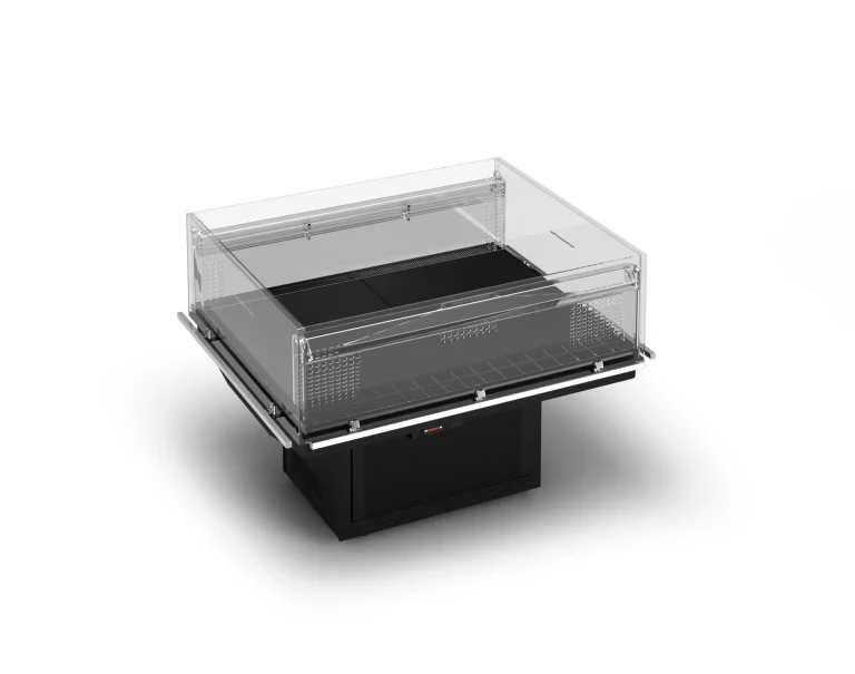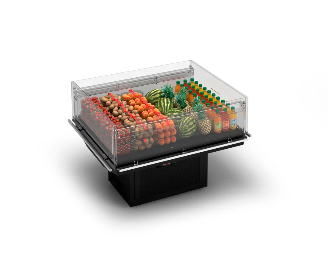 Promotional plug-in island, at normal temperature, suitable for the display and self-service sale of prepacked products such as delicatessen, dairy products, meat, fruit and vegetables.