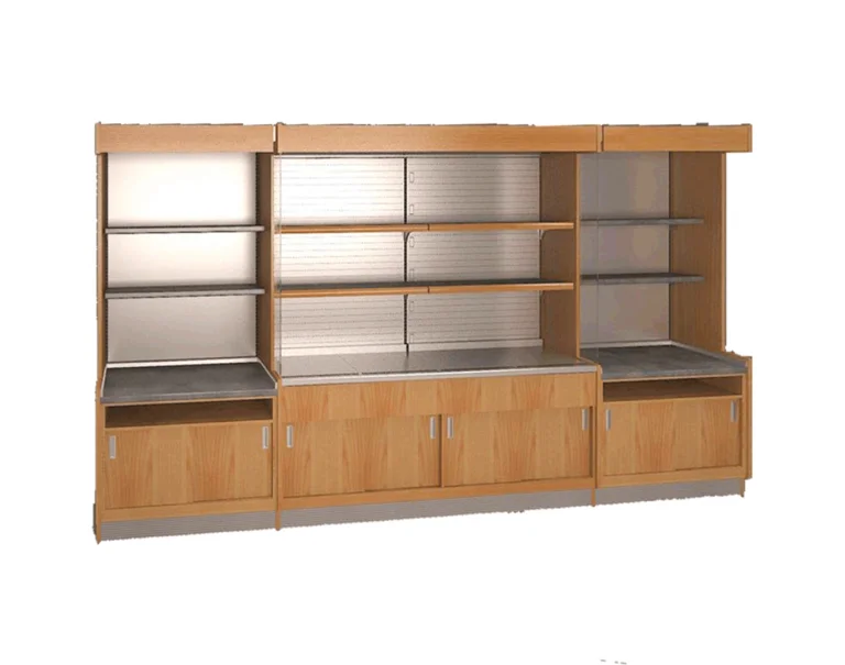 Vertical rear cabinet, at normal temperature, characterized by essential and square design and great versatility that makes it suitable for any furnishing context, from small traditional shops to hypermarkets. The cabinet is also available with refrigerated storages on the closed base.