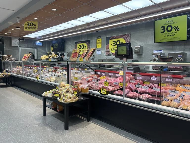 Banco tradizionale refrigerato servito, a temperatura positiva, adatto all’esposizione e vendita di carni, salumi, latticini e gastronomia.