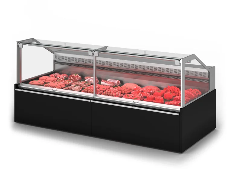 Banco tradizionale refrigerato servito, a temperatura positiva, adatto all’esposizione e vendita di carni al taglio.